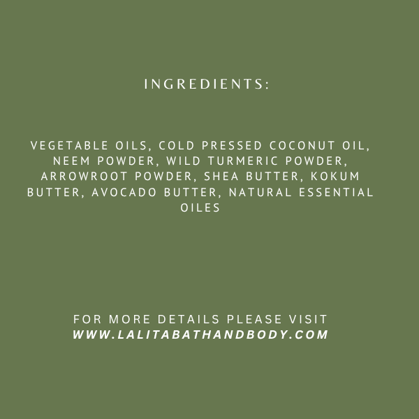 Vegetable Oils, cold pressed coconut oil, arrowroot powder,water,lye, shea butter, kokum butter, avocado butter, natural essential oils, Turmeric, Neem powder.