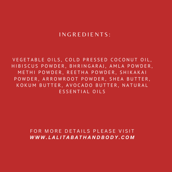 Vegetable Oils, cold pressed coconut oil, hibiscus powder, bhringaraj, amla powder, methi powder, reetha powder, shikakai powder, arrowroot powder, shea butter, kokum butter, avocado butter, natural essential oils