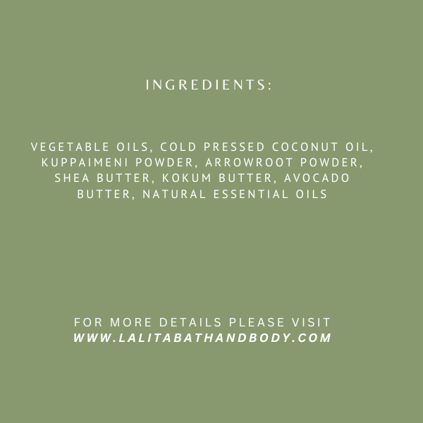 Vegetable Oils, cold pressed coconut oil, arrowroot powder,water,lye, shea butter, kokum butter, avocado butter, natural essential oils, Kuppameni powder.