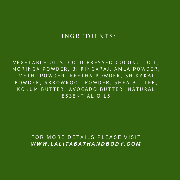 Vegetable Oils, cold pressed coconut oil, moringa powder, bhringaraj, amla powder, methi powder, reetha powder, shikakai powder, arrowroot powder, shea butter, kokum butter, avocado butter, natural essential oils