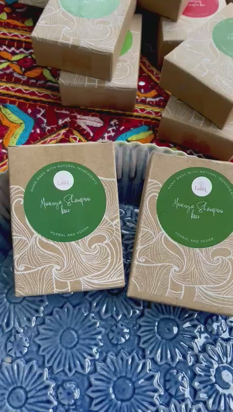 Made with the goodness of Moringa , herbs, natural oils , plant based butters and pure essential oils. None of the harsh chemicals, fragrances and preservatives used in standard soaps. The shampoo bars are vegan, cold processed and done in small batches. Our herbal hair wash soap brings the goodness of our customer favorite herbal hair wash, in an easy to use form.